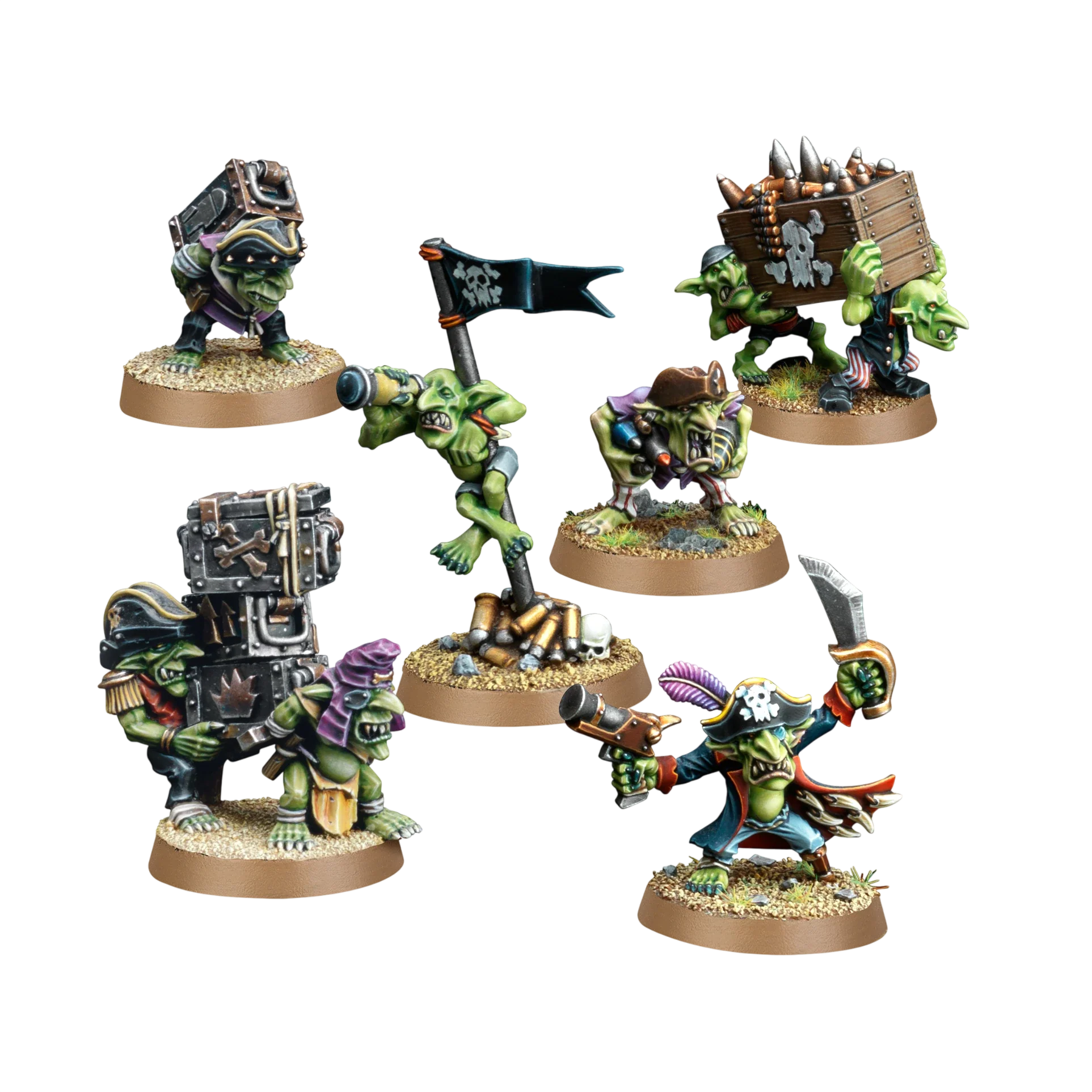 This multipart metal kit builds 6 Freebooter-themed Ammo Runts, diminutive creatures who lug heavy crates of bullets and explosives for your Orks armies in games of Warhammer 40,000. Included in this characterful bunch is one climbing a flagpole to spot enemies, and another brandishing his fanciest gear to impress his mates. On the tabletop, they can be used to represent Ammo Runts in your units of Flash Gitz and Nobz, and are a fun addition to any collection.